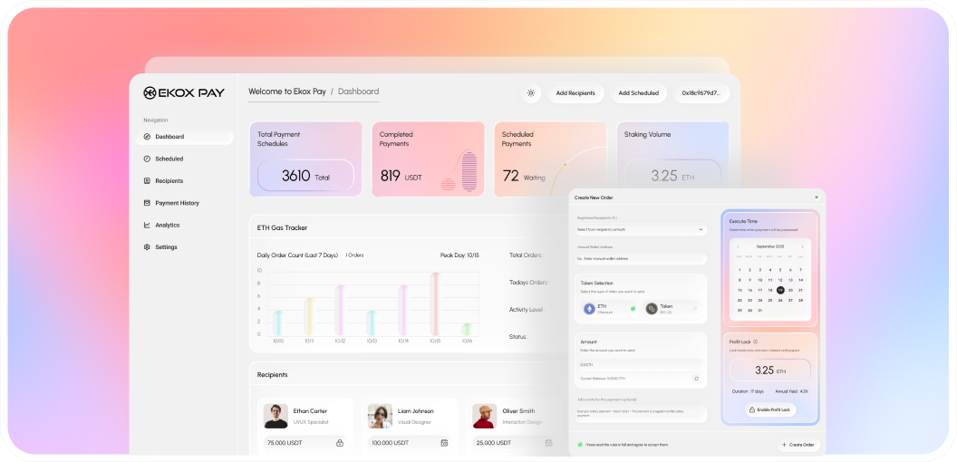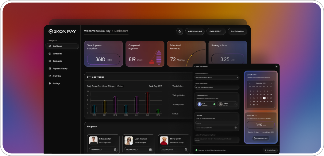 EkoxPay is a blockchain-native financial automation system designed to handle scheduled transfers in a trustless, efficient, and yield-bearing way. It allows individuals and organizations to plan payments ahead of time — whether for salaries, rent, subscriptions, or vendor invoices.